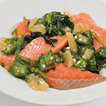 岩内サーモンは、北海道岩内町で養殖されているトラウトサーモンのブランドです。その岩内サーモンに数の子とモロヘイヤ、オクラを絶妙なバランスで組み合わせた本品は、栄養価も高く、さまざまなお客さまに喜んでいただける商品です。