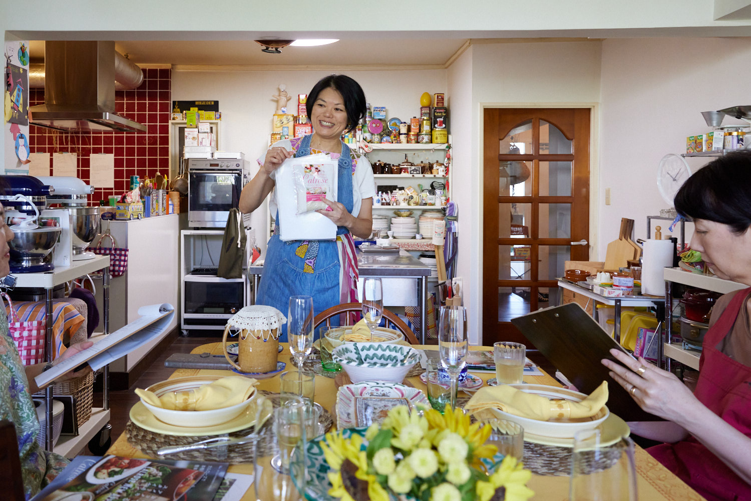 旅行会社での勤務後、イギリス、スペイン、フランスでトータル8年間の食探求留学した経験がある大前先生がこれまで訪れた国は50カ国以上。横浜市内の教室に一歩足を踏み入れると、そこには世界の器でぎっしりの食器棚や、料理に関する洋書がずらりと並ぶ本棚に圧倒されます。この日ダイニングテーブルには、グラナダ焼などスペイン製の食器を中心に、イエローやオレンジ、ブルーといった夏らしい彩りのテーブルセットが準備されていました。3名の生徒さんたちも到着し、いよいよレッスンのスタートです。