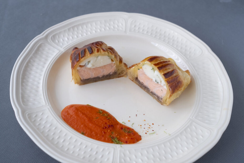 サーモン、きのこのデュクセル、ディル入りのベシャメルソースを重ねてパイシートで包んだ豪華な一品です。ライムを効かせたトマトソースと、バスクの唐辛子「ピメント・デスペレット」をアクセントに添えます。