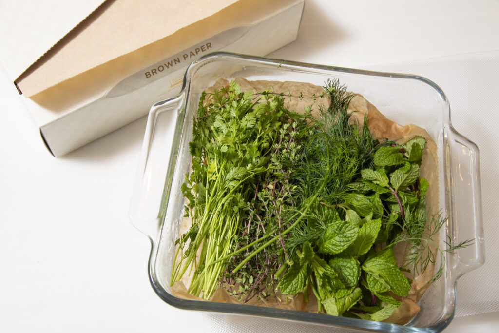 「これはサーモンの包み焼きで使うディルです。パックのまま冷蔵庫に入れておくよりも、このようにキッチンタウパーを敷いた保存容器に移し替えるといいですよ。ハーブを普通のキッチンペーパーで包むとすぐヨレヨレになってしまうのですが、キッチンタウパーは丈夫で破れないので、瑞々しさがそのままキープできる。ぜひお家でも試してみてくださいね」