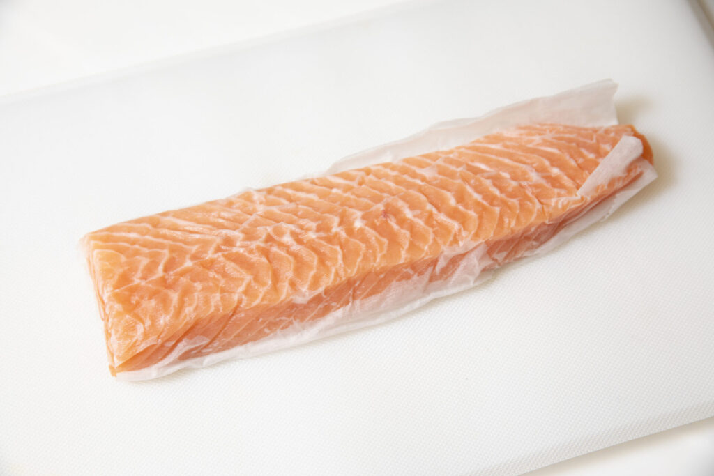 「サーモンを買ってきたらキッチンタウパーで包んで、さらにラップをかけて冷蔵庫に入れます。余分なドリップを吸収しつつ、乾燥を防いでくれるので、この保存方法がおすすめです。パイ包みは、パイ生地に水分が出てしまうのが一番の失敗の原因なんです。ドリップをしっかり取ることで、パイがパリッと仕上がりますよ」