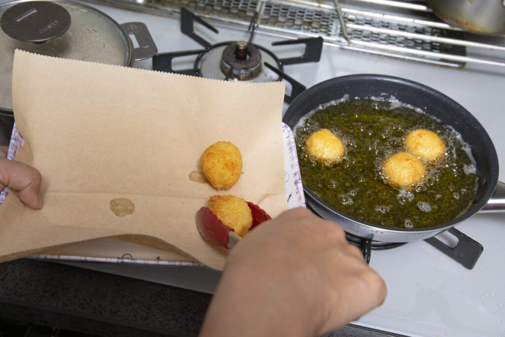 五色あられをまぶしたものは色が変わりやすいため170度で2分、パン粉のものはきつね色になるまで170度で1分半ほどを目安に揚げます。中身は水分をしっかり飛ばしたリゾットを丸めたものなので、すでに火が通っている状態。揚げる際は色づきを確認するだけでOKというのも手軽なポイントです。揚げたてをキッチンタウパーで受けることで、余分な油が取れ、軽やかな食感に仕上がりました。