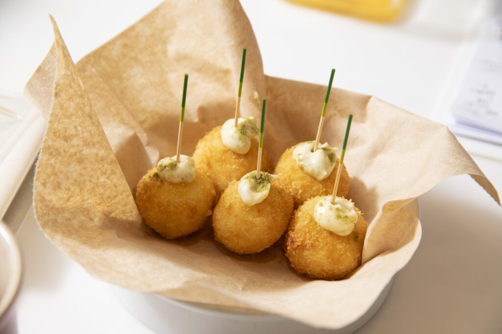 イタリアのライスコロッケ「アランチーニ」を、京都・わらじやでヒントを得たという山椒マヨネーズと、錦市場の五色あられで和風にアレンジ。