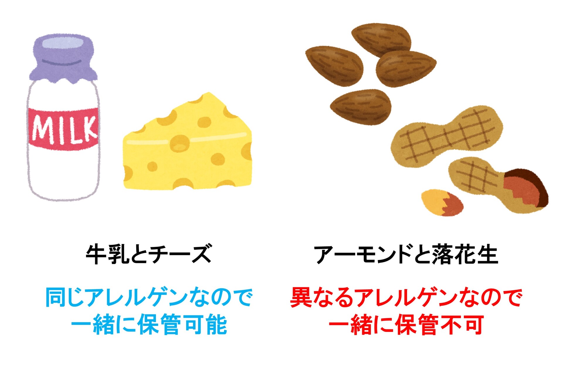 牛乳とチーズなど、同じアレルゲン食品は一緒の場所に保管しても問題ありません。