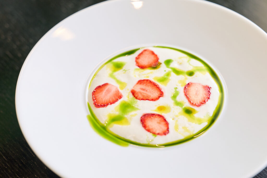 「あまおう」と乳の相性の良さは日本人なら言わずもがな、今回はミルキーなブッラータの中に潜む「あまおう」の酸味が心地よいアクセントとなっている。さらに時間とともにブッラータの海の中で水分を吸ってフレッシュ感を取り戻し、味わいも徐々に変わっていくという驚きに満ちた一皿だ。