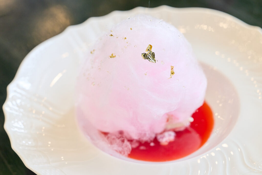 ジャージー牛のミルクで作るジェラートにアマレッティ、「あまおう」のクラッシュとソース。上に添えられた、ほんのり「あまおう」の赤に染まった綿飴もこのために機械を導入したという気合の入りようだ。