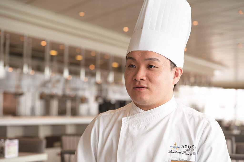 製菓学校在学中、横浜に遊びに来たら偶然、「飛鳥Ⅱ」が停泊していて、船に乗りながら、海外や日本中で仕事できることに憧れました。街場の店で修業後、2024年にペストリーシェフとして入社。「飛鳥Ⅲ」の就航に向けてメニューを開発し、ほぼ毎月、フィリピンに出張してトレーニングを行うなど、今28歳ですが、この歳ではできない経験を積んでいます。英語でわかりやすく伝えることが重要なので、このときの経験が役立っています。一緒に働くようになってからは、仕事がキツいときもフィリピン人は明るく、ときには歌いながら仕事をするので僕が元気を貰っています(笑)。