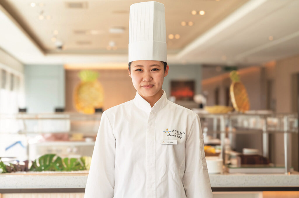 今年入社6年目で、飛鳥Ⅱのプレミアダイニング「ザ・ベール」のセクションシェフを務めています。厨房スタッフは39名で、そのうち女性クルーは私を含め3名。フィリピン人を含め、さまざまな場所で経験した人が集まる職場なので、キャリアを問わず他のクルーから学ぶことも多い。会社に申請すればアルバイトが可能なので私は長期休暇中にも都内の洋食レストランで働いていて、そこでの調理経験も船の仕事に役立っています。