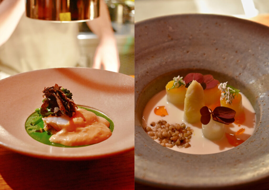 右はフランス産ホワイト・アスパラガス、イベリコハムでインフューズしたコシヒカリとアスパラガスのソース、燻した卵黄のコンフィ、そばの実。左はアンコウの炭火焼、パープル・ブロッコリーのソース、黒トリュフ、骨髄と醤油のエマルジョン・ソース。いずれも長江さんの料理。