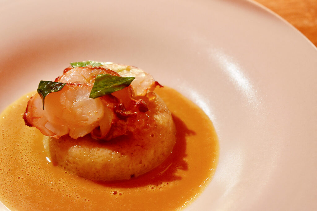 クレームフレーシュで和えたワサビ風味ホタテのタルトレット、ブラッドオレンジがアクセントに。この他にもハリボットをのせたレンズ豆フリッター、マグロのそば粉タルト、枝豆フムスをのせたヒヨコ豆のクラッカー、ハイビスカス風味の土佐酢で華やかさを添えた青じそソルベといただくオイスターなど、カナッペ類が充実。