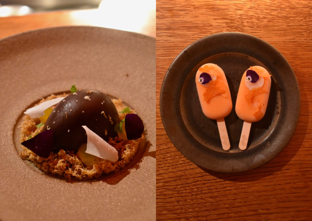 ジンジャー・ジュレと人参チップスを添えたマンゴーと人参のアイスクリームは長江シェフ。17世紀の王様のリクエストにより生まれた卵をかたどったサフランのデザートはチェットさん。