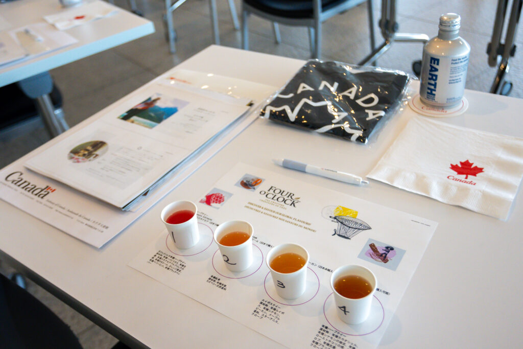スイーツと合わせて提供されたのは「メープル香るブラックティー」だ。第一部で試飲されたメープルピーカンティーとは別の種類で、日本ではまだ取り扱いのない紅茶だという。メープルシロップの甘い香りに、ほのかにウッディなニュアンスが重なり、カナダらしい風味を感じさせる一杯。甘い余韻を残しながらも後味はすっきりとしており、デザートとの相性の良さも感じられた。