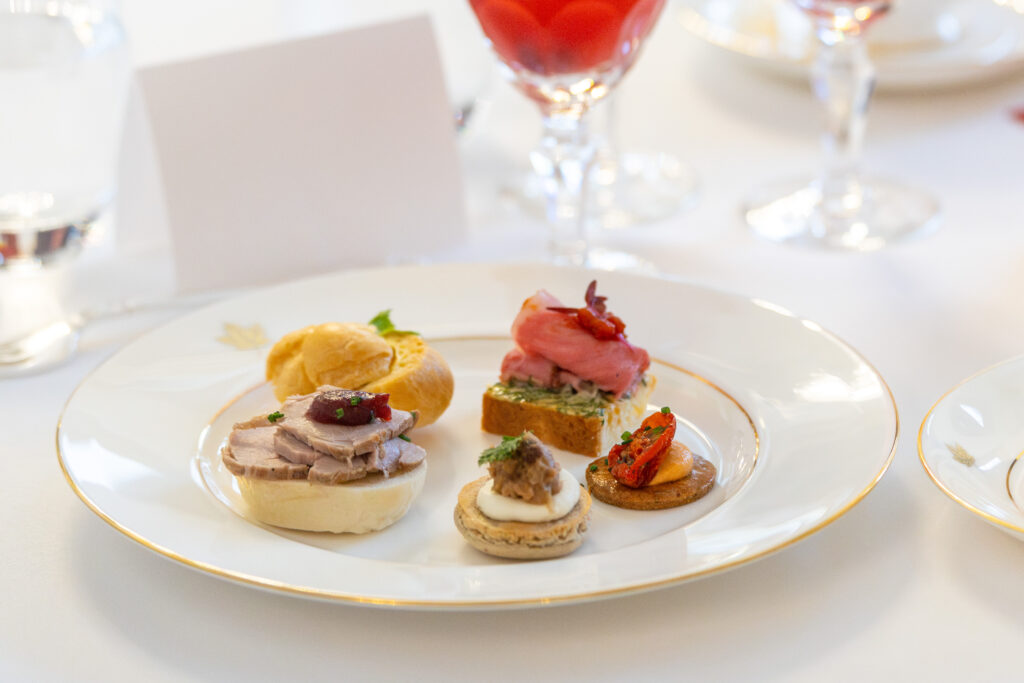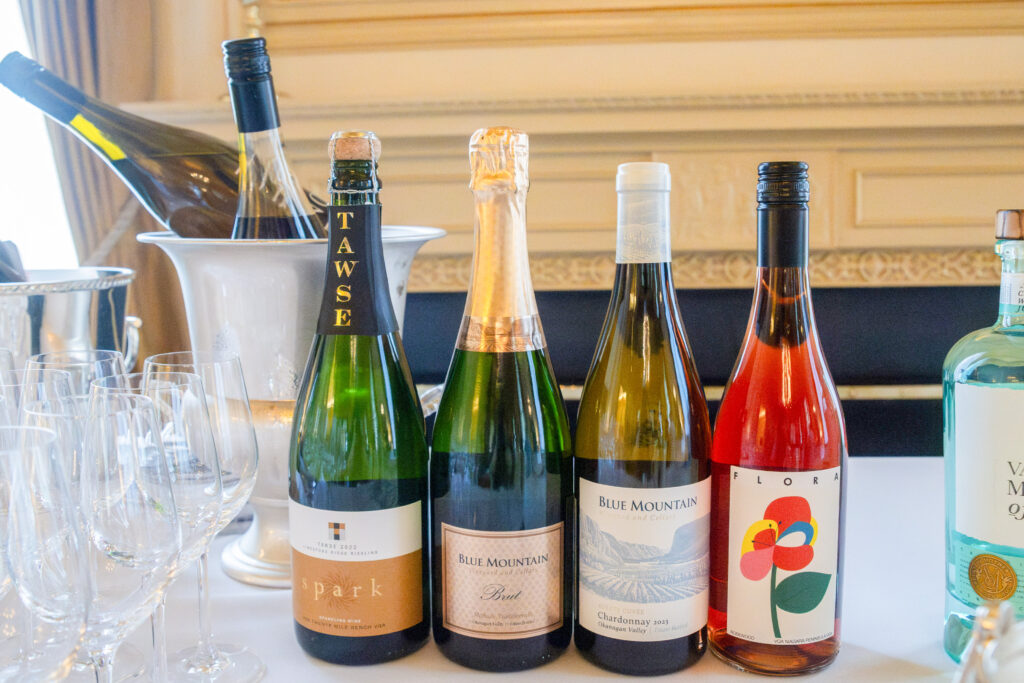 この日は、ナイアガラ地域のスパークリングワイン「Tawse 2022 Spark Riesling」がアペリティフとして提供され、アフタヌーンティーの始まりを軽やかに彩った。ブリティッシュコロンビア州産の白ワイン「Blue Mountain 2023 Estate Cuvée Chardonnay」は、軽やかな酸と果実味が特徴で、セイボリーやスイーツとも好相性だ。