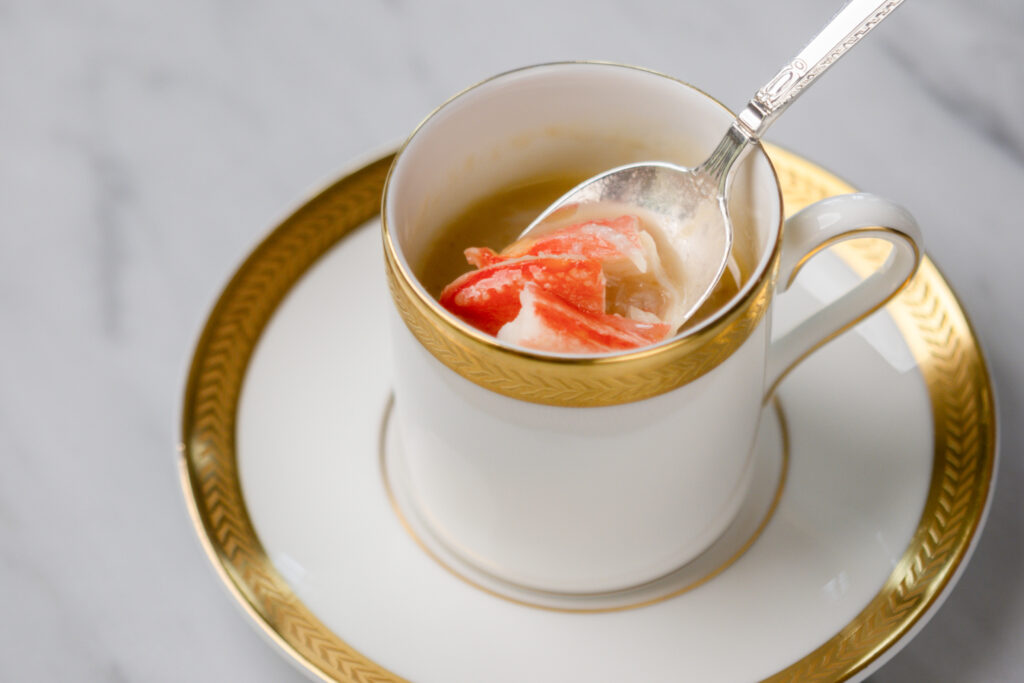 今回はカナダ産ズワイガニを使い、アフタヌーンティーに合わせてデミタスカップの一口サイズで提供された。小さな一杯ながら、具材の旨味をしっかりと感じられる仕立てとなっていた。