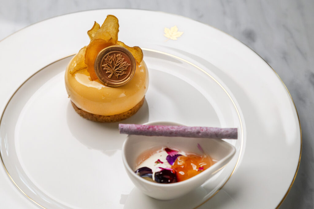 メープルのバヴァロワをベースに、メープルシナモンクランブル、アンバーメープルで仕上げたリンゴのジュレ、メープルキャラメルシャンティが層をなし、フォークを入れるとメープルシロップとカルヴァドスのシロップがとろりとあふれ出す。複雑で奥深い味わいに会場からため息がもれた。