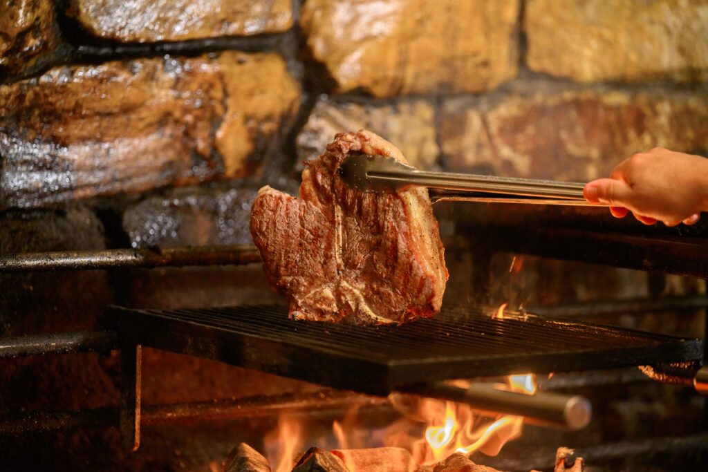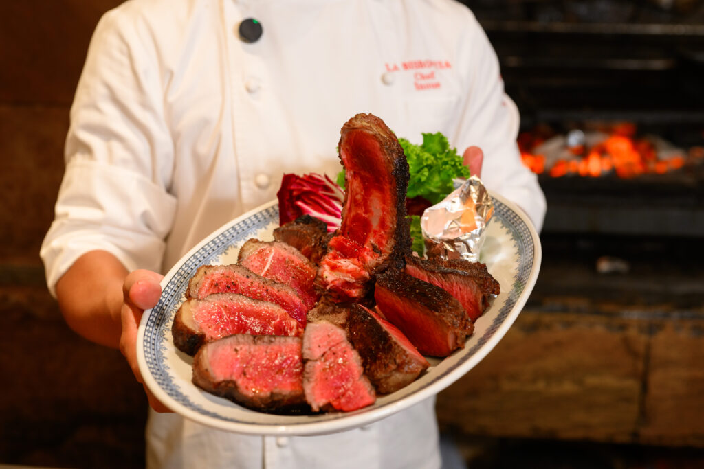 井上 アイルランドの牛の品種としてアバディーンアンガス種、ヘレフォード種、デクスター種などがあります。当店では薩摩和牛も使っているため、それと対極にあるタイプとして、より赤身のうま味が味わえるヘレフォード種を使っています。もう少し霜降り感を求めるならアンガス種がいいでしょうね。希少性の高いデクスター種は入荷時期が限られています。当店の使用部位はTボーンまたは骨つきリブロースで、炭火焼きですね。