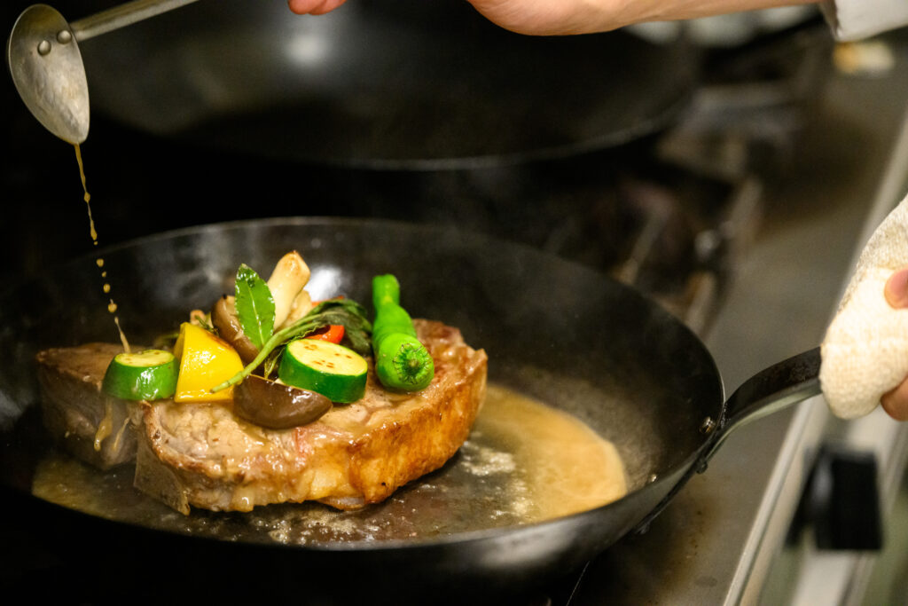 西沢 当店では不定期ですが日曜の夜に「ビステッカ・ナイト」を開催しており、おかげ様で大変好評です。通常1kgからのオーダーになるビステッカを、少人数のお客様にも食べていただけるようにと考えたもので、計20kg分のTボーンを焼き、すべてのお客様でシェアするスタイルに。ワインつきのコースをサービス価格で提供しています。