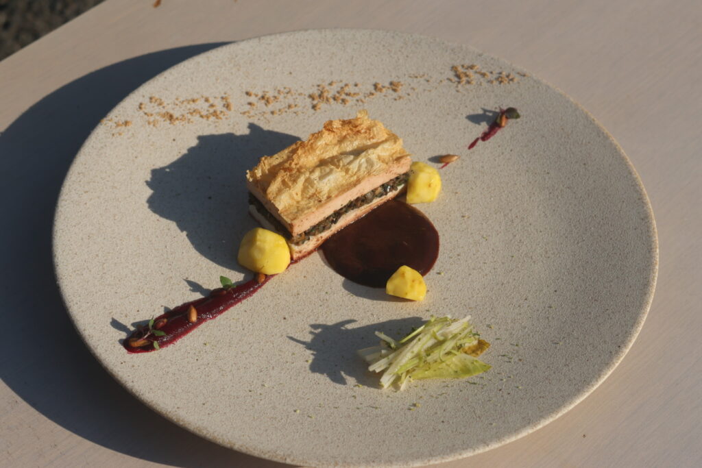 水でもどした神奈川県産大豆を、エネルギー負荷の低い石臼で挽いて豆乳を作り、伊豆大島の天然にがりやスパイスを加えた豆腐を作って厚揚げに。間にはキノコのデュクセルを挟み、豆腐を作る過程で引き上げた湯葉で包んで焼いて精進料理の“見立て”を再構築した。豆腐を作った際に出るおからも乾燥させてパウダーにし、廃棄ゼロを実現している。