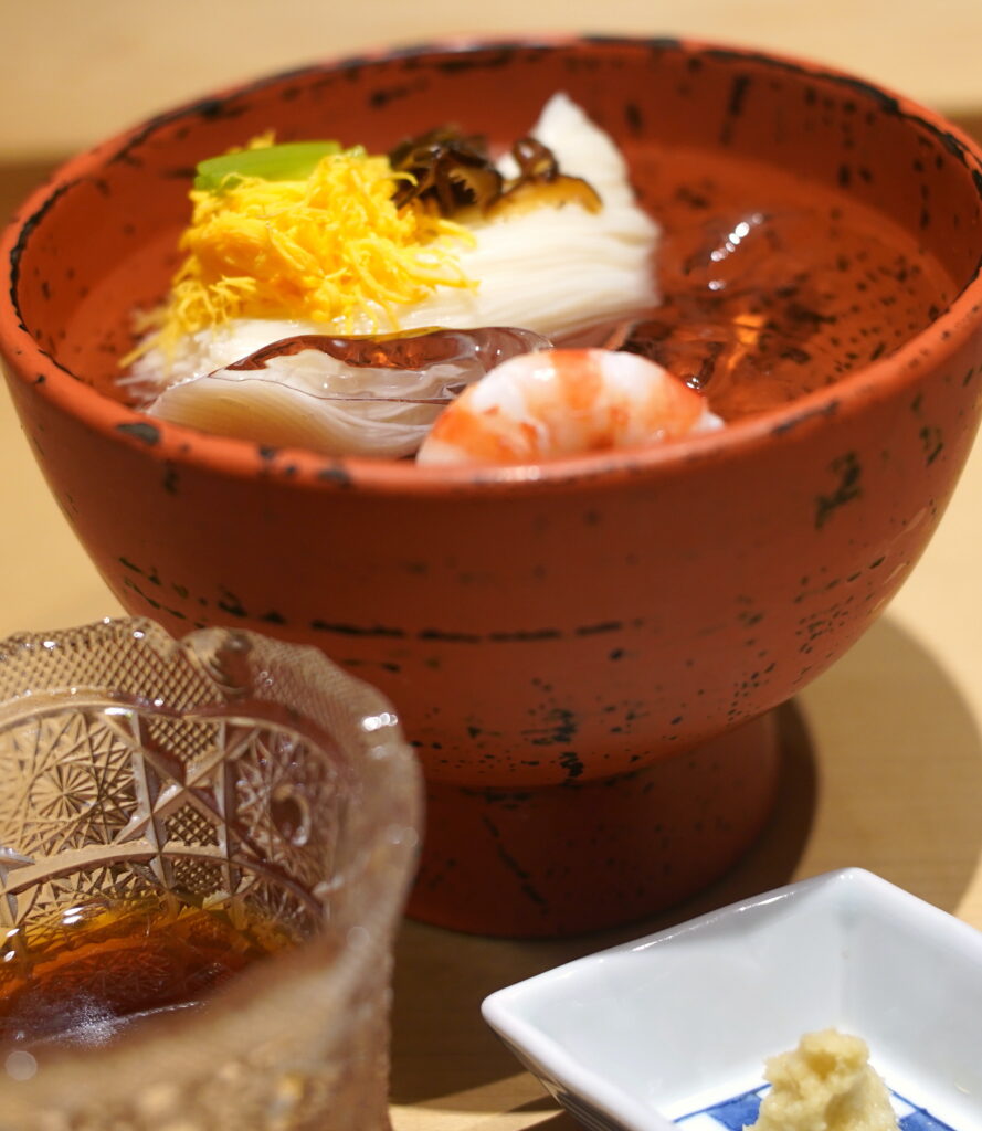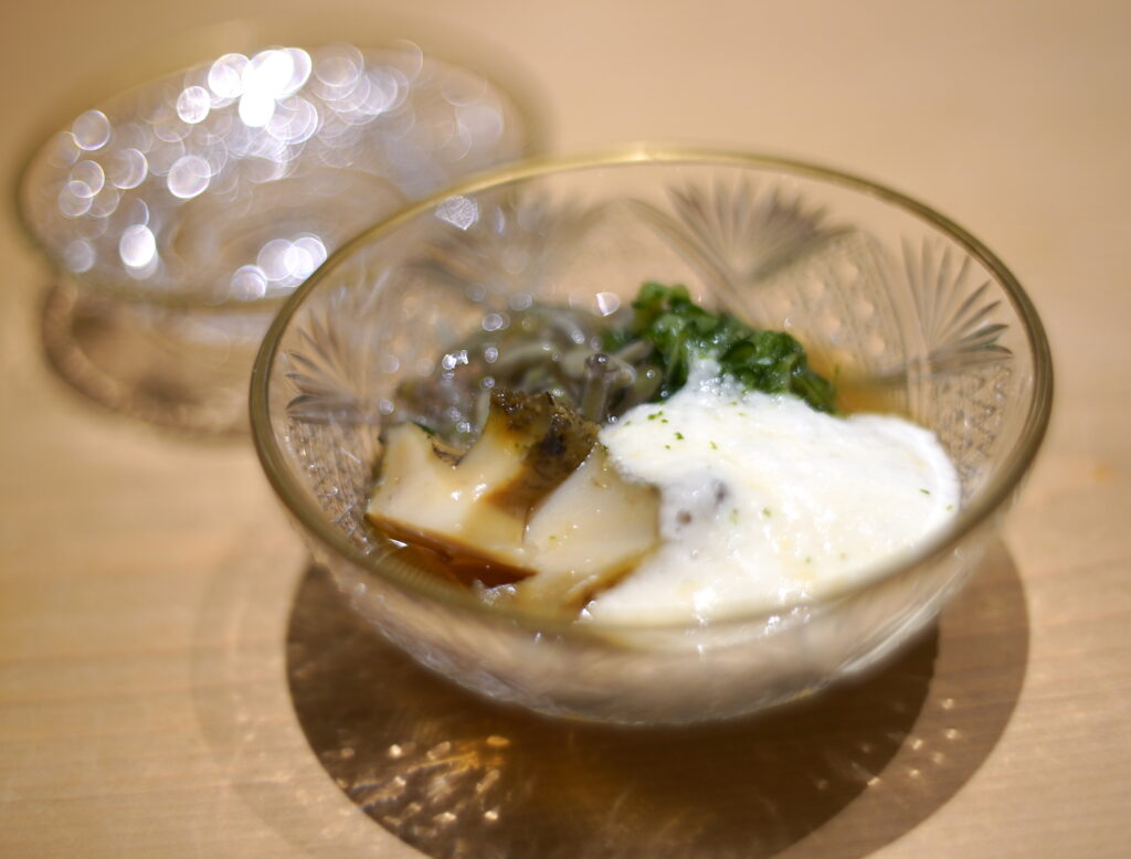 徹底的に水分と青臭さを搾り切った胡瓜の食感が、溌剌を生み出し、対照的なとろろ芋やじゅんさいのぬるりとした粘りが加わる。