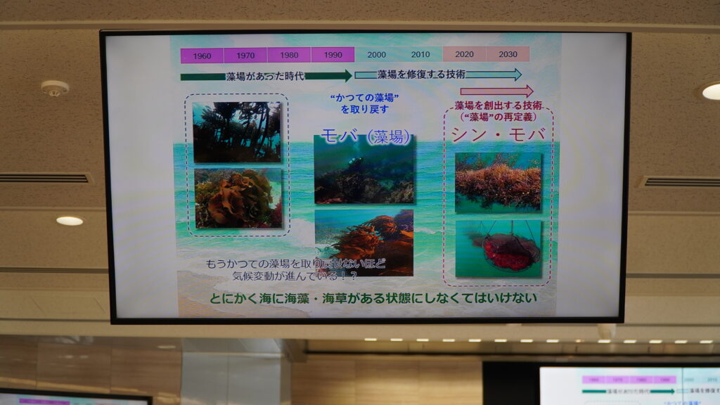 まず共有されたのは、深刻な磯焼けの現状。気候変動による海水温の上昇とアイゴやウニといった藻食動物の過剰な食害により、かつて存在した藻場の3、4割(場所によっては5割)が消失。これは九州から静岡までの森林が消滅したに等しい面積だというから驚く。この消失がサンマ、マグロ、といった水産資源の激減に直結しているという。