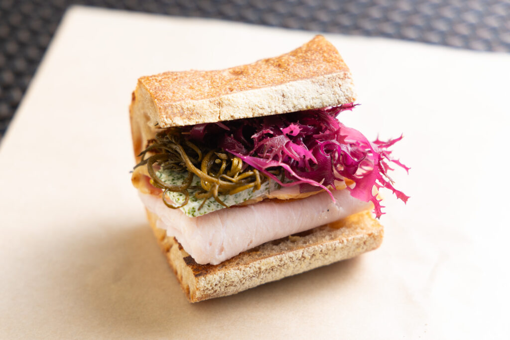 写真は試食で振舞われた「レフェルヴェソンス」の生江史伸さんによる「ジャンボンブール」。バターをスジアオノリを加え混ぜた海藻バターとし、風味を加えた。具材のひとつにワカメとアカノリのピクルスを挟んで酸味を添え、食べ飽きない構成とした。