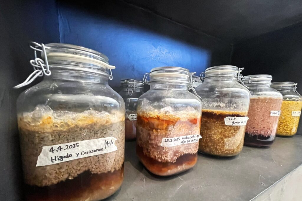 厨房の周りのキャビネットには、一目で発酵食品とわかるガラス容器がいくつも置かれていた。「Higado y corazones(肝臓と心臓)」「Nakaochi(なかおち)」「Maiz(トウモロコシ)」などと手書きしたラベルが張ってある。醤や麹、味噌、ビネガーなどの調味料は「100%厨房で仕込んでいる」と前田シェフは言う。