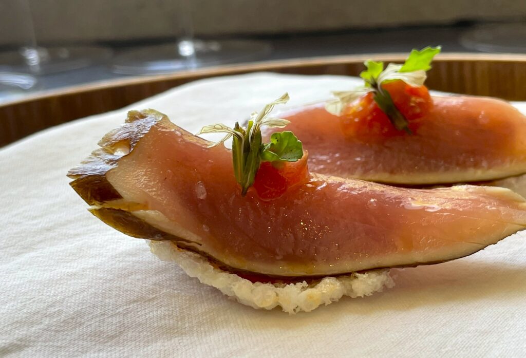 続いてカウンター席で出される「タコケタ」は、たこ焼き風味のクロケタ(コロッケ)だ。紅ショウガではなく、庭にあるプラムの赤い葉と一緒に漬けこんだショウガを使っている。さらには、クラッカー状に揚げた米の上にトマトとビンチョウマグロのスライス、赤ピーマンをのせた「エウスカル寿司」。バスクの伝統料理「マルミタコ」をもし日本人が作ったら、という発想が生んだ一品だ。エウスカルという言葉は「バスクの」という意味を持つ。