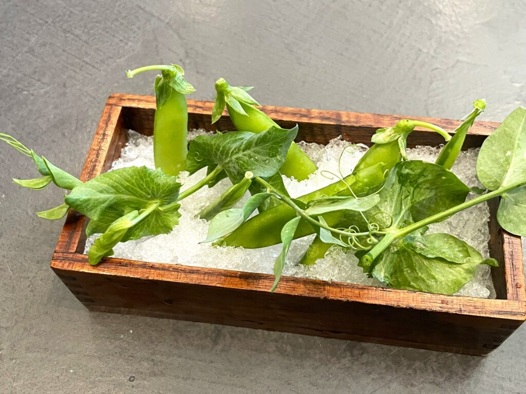 刃渡り40cm以上ある刺身包丁で前田シェフが切り出したマグロを、スタッフが手早く調理していく様子を眺めていると、いつのまにか目の前に木箱が置かれていた。枝ごと収穫し、氷でしめた涙豆だ。ぴんと張った若々しい葉や弦を目で楽しみつつ味わう、プチっと弾けるような新鮮な豆の食感。それが30mも離れていない土の上から収穫されたばかりであることを、喜びと驚きをもって実感する。