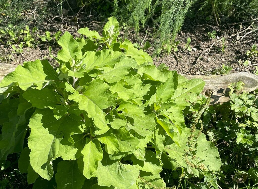 前田シェフは、アスパラ畑の傍らに生えている野草を指さす。