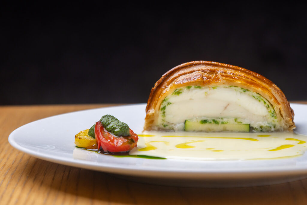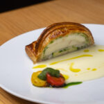 三皿目は、浪江産ヒラメを主役に据えたパイ包み。ナイフをサクッと入れると立ち上るパイの香ばしさに負けない、海の旨みが広がっていく。