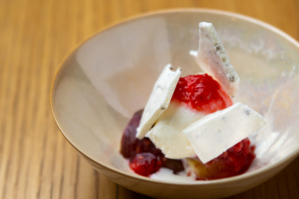 コースの最後を飾ったのは、パブロバならではの食感のコントラストが際立つデザート。浪江産黒イチジクに浪江産エゴマを掛け合わせ、軽やかに砕けるメレンゲに、黒イチジクのねっとりとした食感とアイスクリームのしっとり感を重ねた。