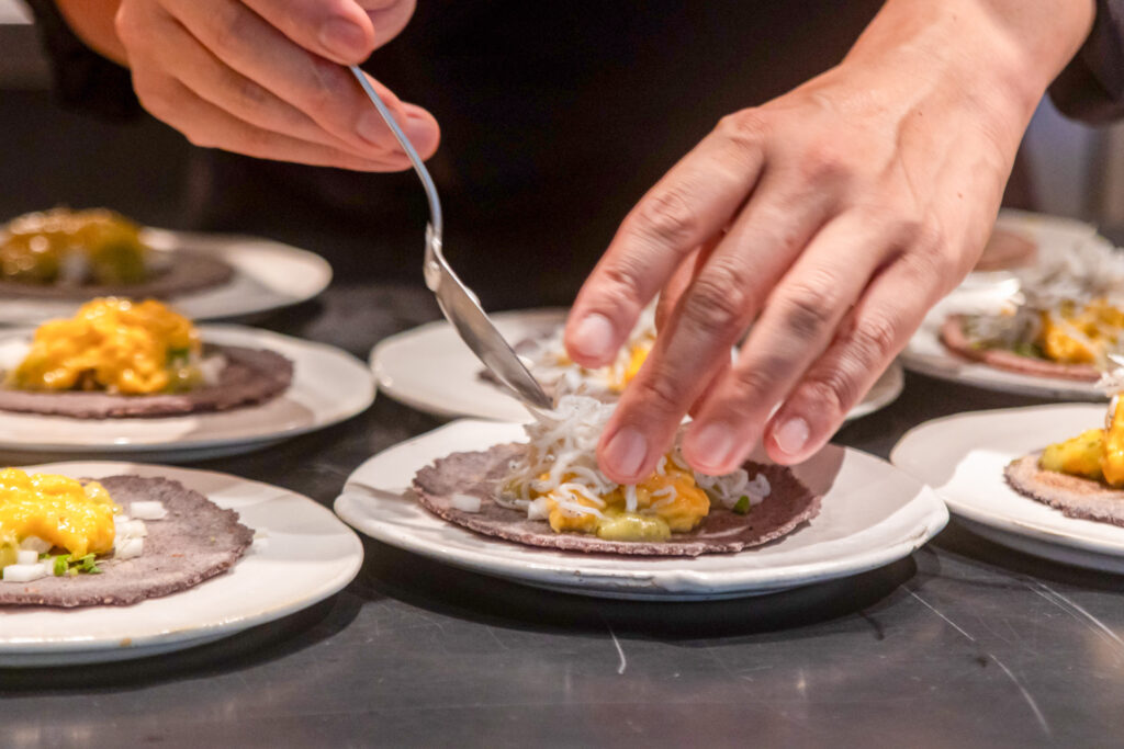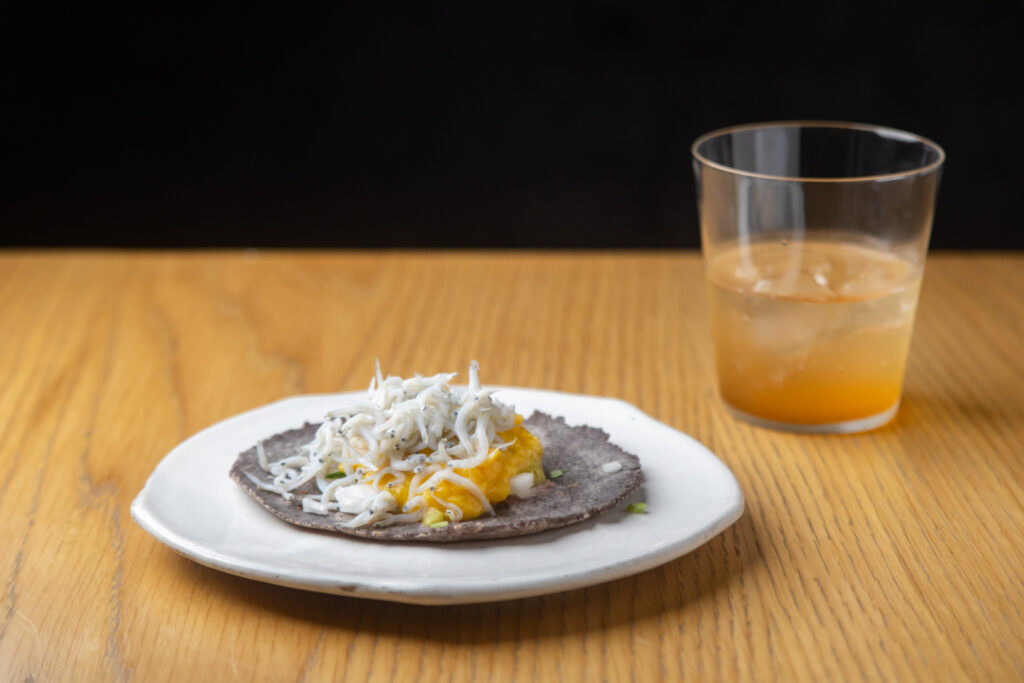 二皿目は、浪江の食材にメキシコのスタイルを掛け合わせた、遊び心に富んだ前菜。中村シェフとしては“珍しい”ひと皿だが、「サムライガーリックの黒ニンニクは海外の食材との相性がよく、浪江のシラスも世界中の料理に応用できる力強さがある」ことから閃いた。