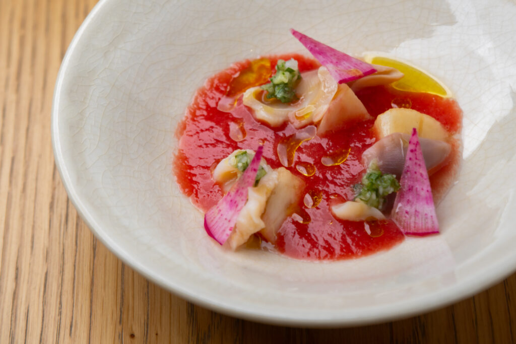 一皿目は、ホッキ貝に桃を合わせたガスパチョ。甘い果実と貝の旨みという意外性のある組み合わせにキュウリのサルサヴェルデが爽やかさを添え、全体をまとめ上げるのは、昨秋に商品化されたばかりの100%浪江町産オリーブオイルだ。