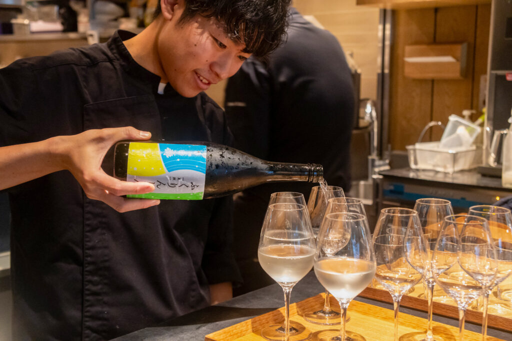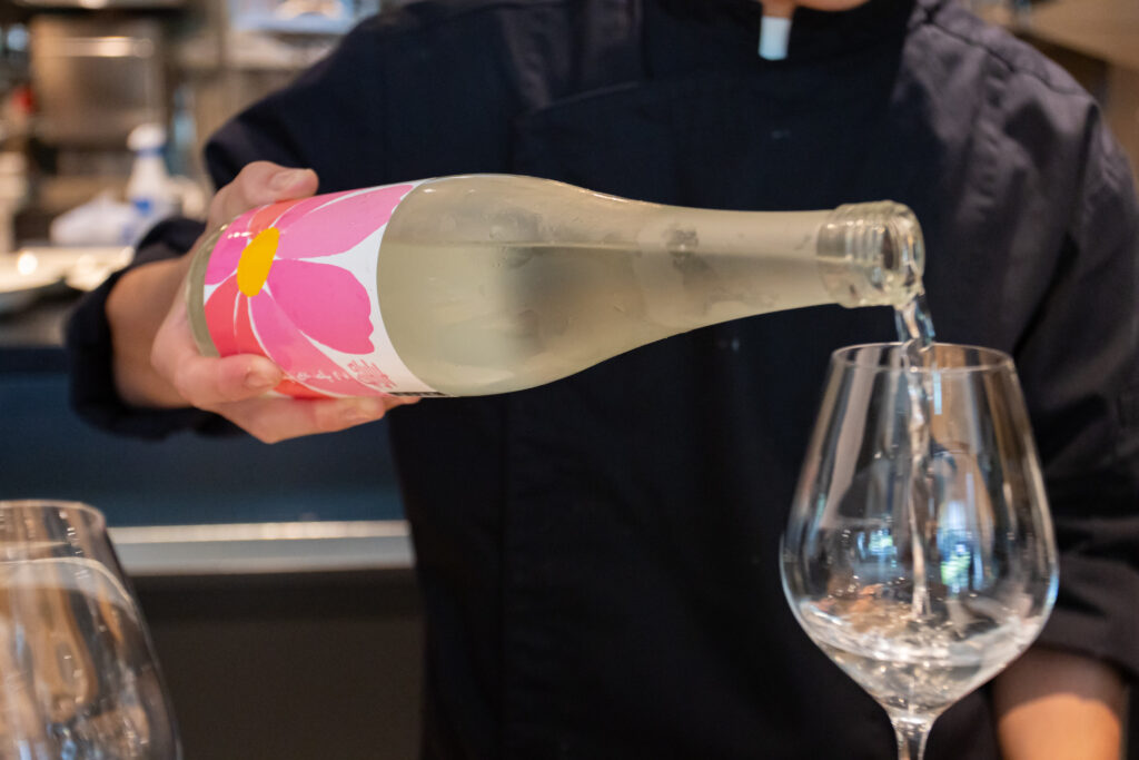 ペアリングには、浪江産の梨を100%使ったジュースとシャーベットを沈めたノンアルコールドリンクと、福島県のオリジナル酵母2種をブレンドで醸される鈴木酒造店の純米吟醸「ふくりんりん」が用意され、料理の余韻を豊かに引き立てる。