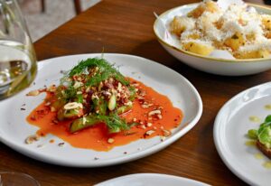 伝統料理からは、トルコ風餃子のマンティ。甘辛く調理した完璧なプルド・ラムが自家製餃子の皮になじみ、スパイスが香るタルカ・オイルと、ニンニクのコンフィ入りヨーグルト・ソースが濃厚だが、脂っぽさを微塵も感じさせない。ここではトルコ料理の基本となるサラダ、チョバン・サラタス(羊飼いのサラダ)でさえ全く異なるレベルへと昇華され、その丁寧な下拵えと素材の良さ、まろやかなドレッシングに驚かされる。