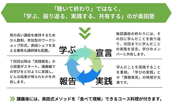 A:奥田シェフは、地域活性化に対する自身の経験とメソッドを、シェフだけでなく広い範囲の関心を持つ方々に伝えたいと考えています。従来の講演会では伝えきれない内容を、奥田塾を通じて参加者に深く理解してもらい、実践に移してもらうことが目的です。