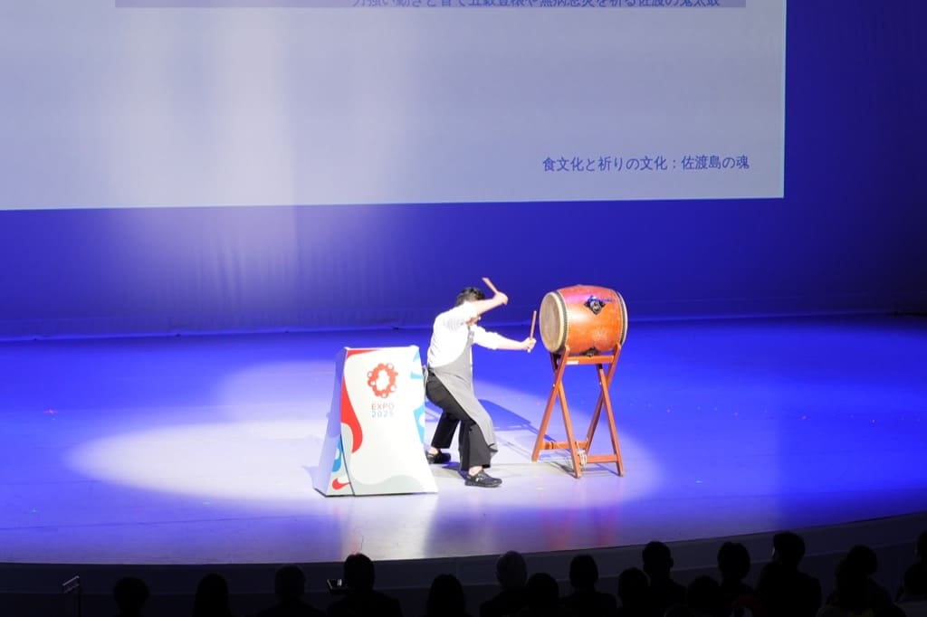 須藤良隆氏は、まず自身の食の哲学をピラミッド構造で論理的に解説した。その冷静な語り口から一転、プレゼンテーションのクライマックスでは、故郷・佐渡島に伝わる伝統芸能「鬼太鼓」を自ら実演。太鼓の激しい音が会場に響き渡った。