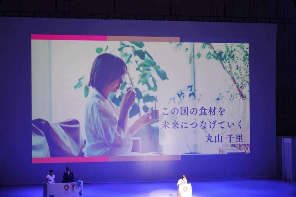 唯一の女性ファイナリスト、丸山千里氏は、フードクリエイターとしての自身の活動を静かな語り口で報告した。プレゼンテーションの根底にあったのは、かまぼこ麺や抹茶ラーメンなど丸山氏が手掛けた商品ではなく、その開発を共にした生産者たちの姿と、彼らが直面する課題だった。