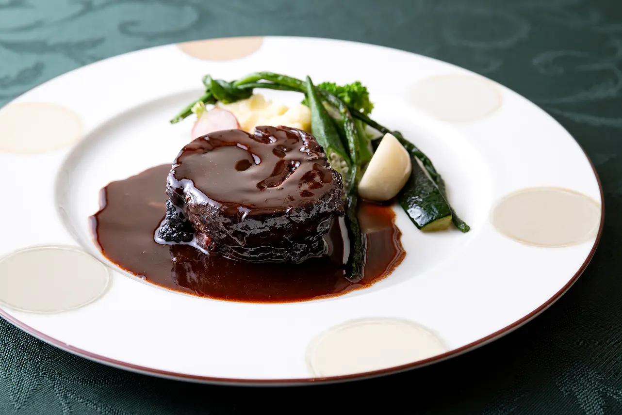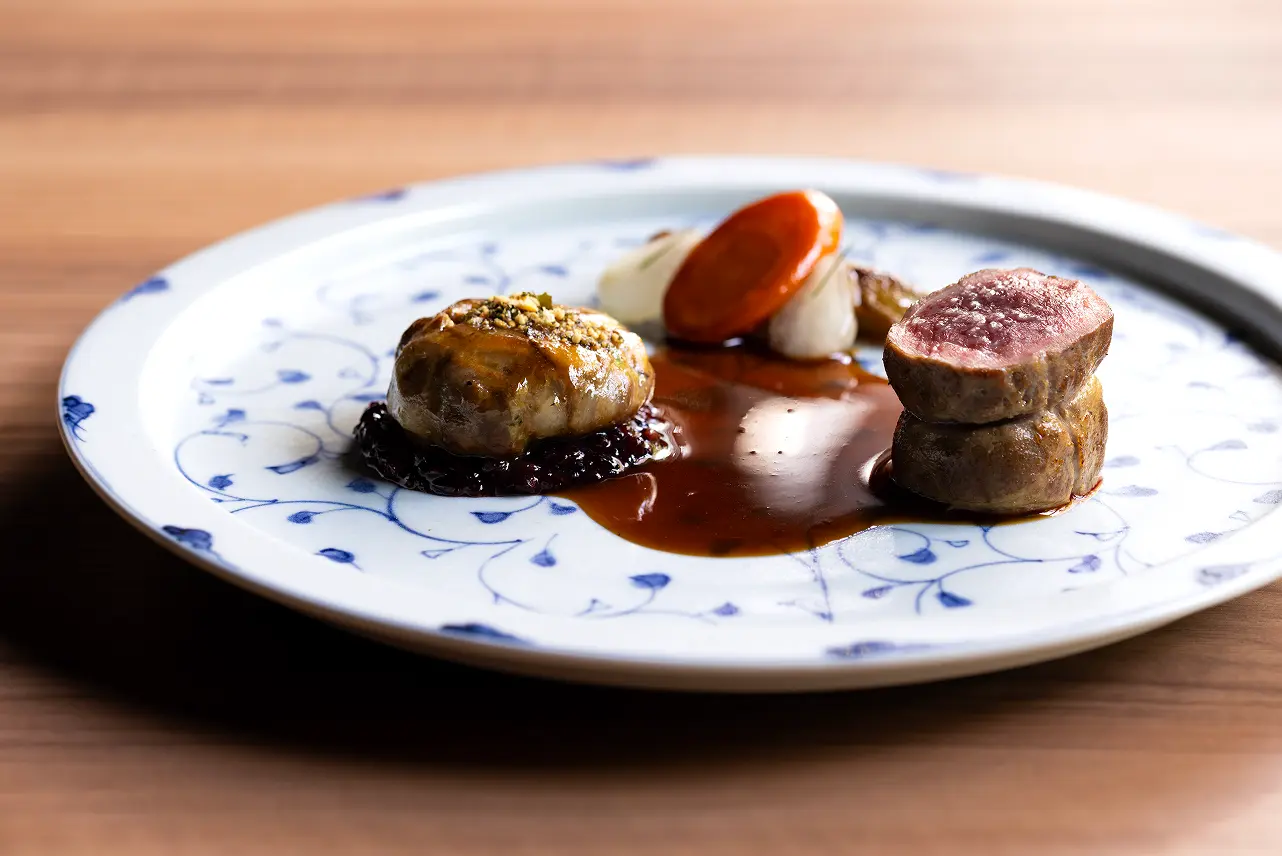 鹿のバラ肉をじっくり煮込み、うま味を閉じ込めたお料理。鹿のフォンと赤ワインソースで深みある味わいに仕上げ、季節野菜を添えて華やかに彩った一皿です。ジビエが初めての方も、馴染みのある方も、どなたでも楽しめる一皿を心を込めてお届けします。