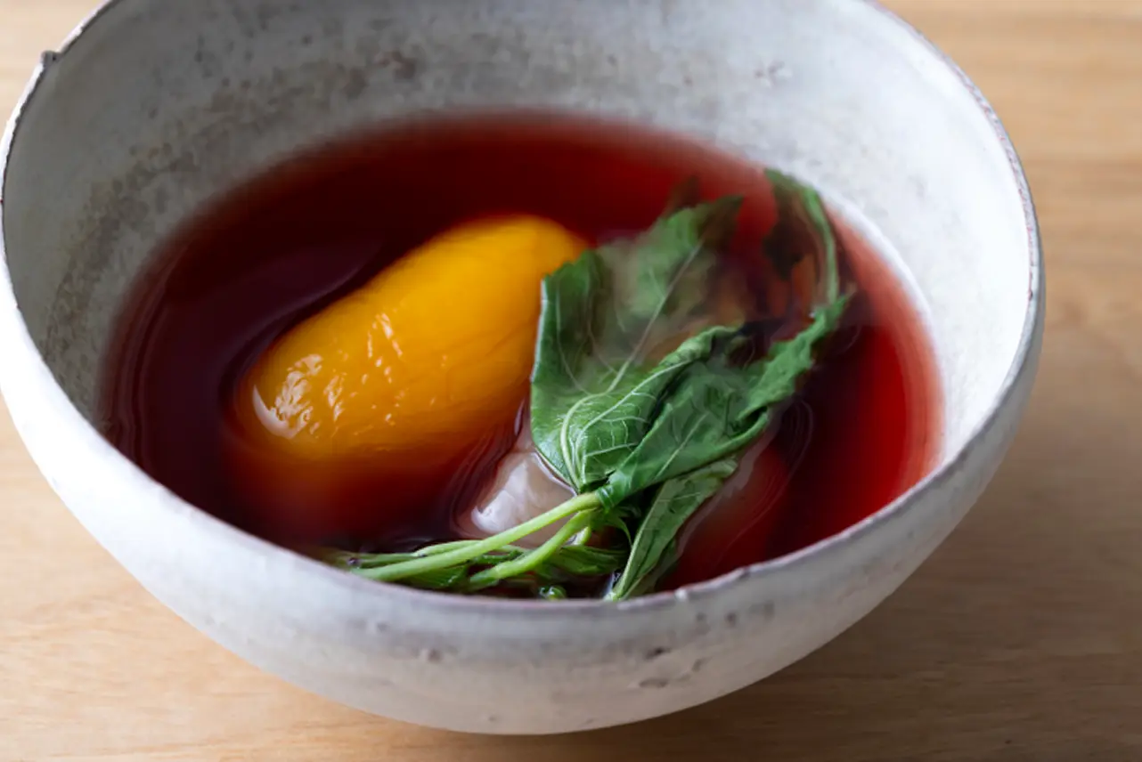 鳥取県産の鹿肉と昆布だしベースのコンソメ。発酵ビーツの酸味をアクセントに、カニ真薯をローストした野菜で包み、栗とくず粉で仕立てた栗豆腐、モロヘイヤを添えました。滋味深く繊細な味わいの一品に仕上がっています。