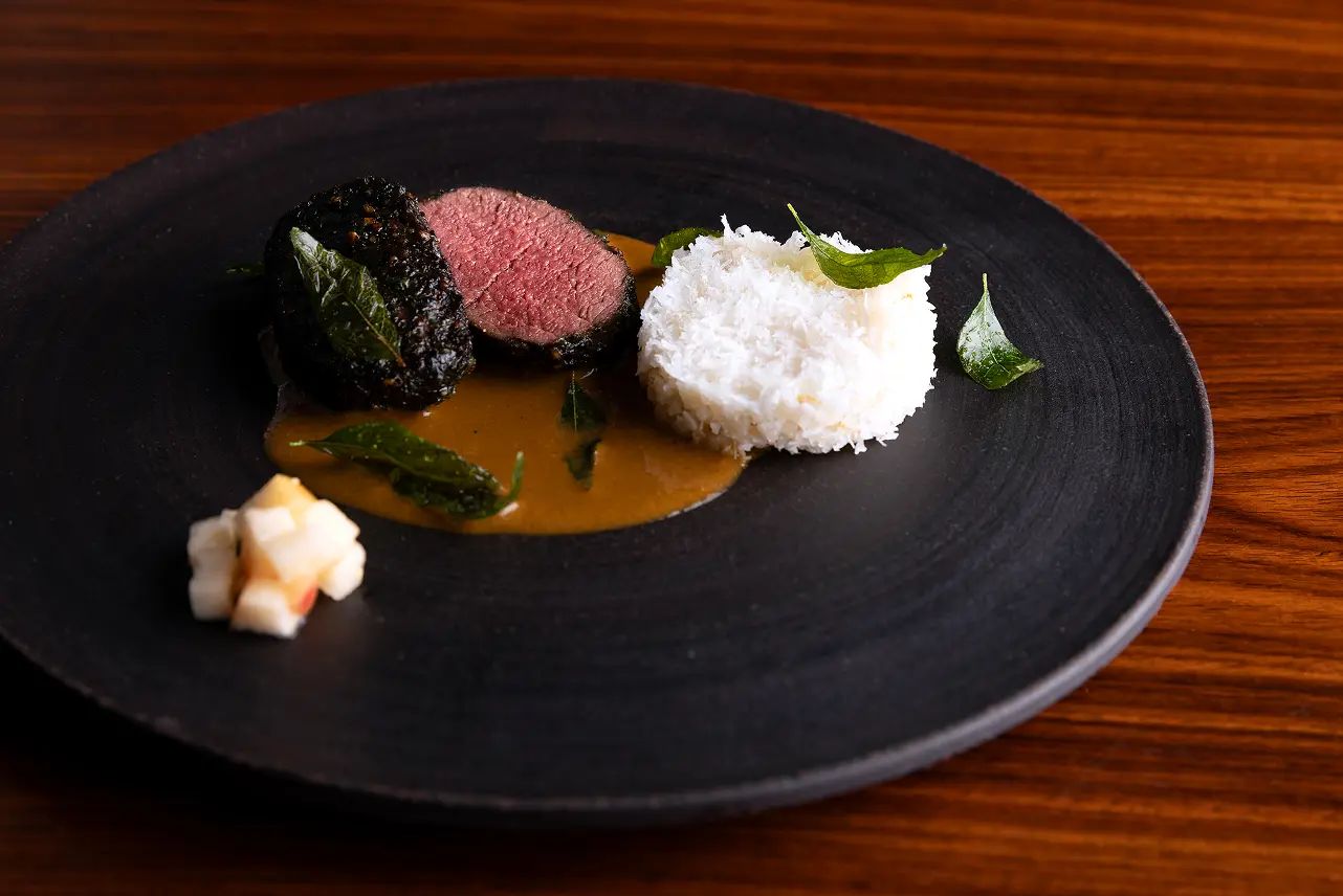 スリランカ語で「美味しいジビエ」と名付けたこの料理は、スリランカの伝統的なスパイスで香り高く仕上げた鹿肉のローストです。黒胡椒とカレーリーフでマリネし、シナモンやカルダモン、トゥナパハ、タマリンドを合わせた奥行きあるソースと、ココナッツと米粉の蒸し物であるピットゥに人参を加え、リンゴのアチャールを添えました。