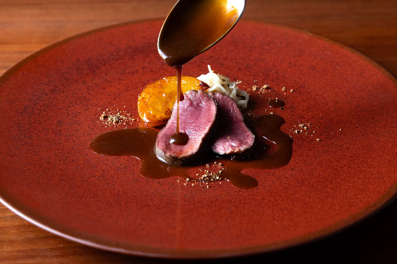 薪火でじっくりと焼き上げ、薪ならではの芳醇な煙香を纏わせることで、鹿ロースの深いうま味を際立たせました。根セロリとキャラメリゼした旬の柿を添え、食感と甘みをプラス。爽やかな酸味のグロゼイユ、鹿肉と相性の良いジュニパーベリーを使ったソースグランブヌールで鹿肉の魅力を最大限に引き立てています。