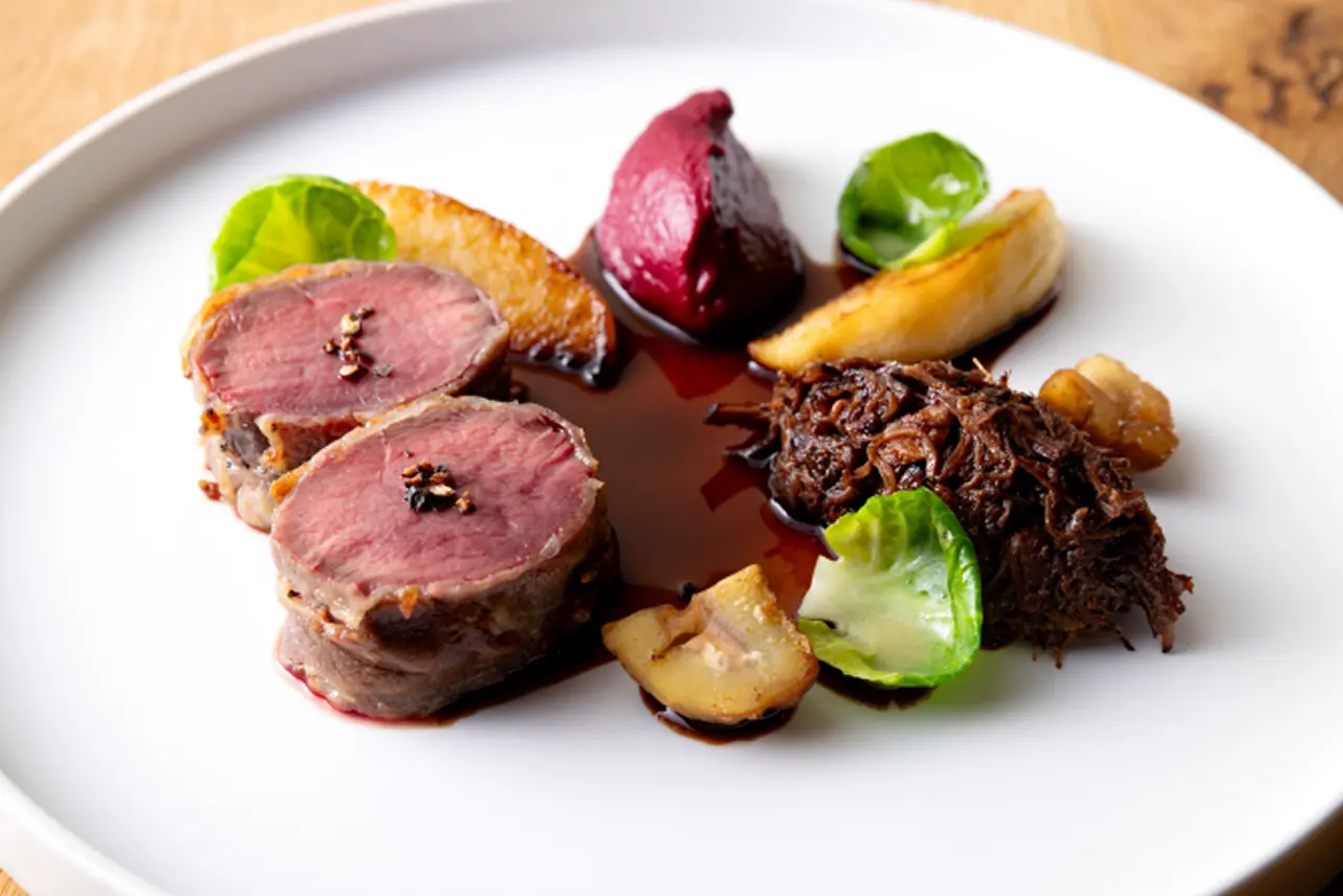 ベーコンで包んだ鹿ロースのロティと、スネ肉とバラ肉は低温でじっくり煮込み、うま味を凝縮させた異なる2つの調理法を楽しめる仕立てにしました。ビーツのピューレ、栗とリンゴで優しい甘みと彩りを添えています。