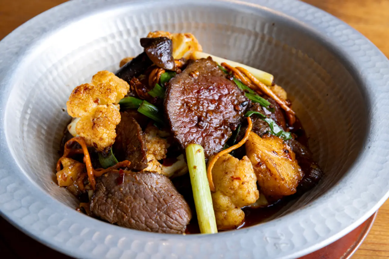 鳥取県産の鹿肉を使った本格中華・干鍋(ガングォー)。熟成したピーシェン豆板醤と自家製ガングォージャンを菜種油で香り高く炒め、はたけしめじ、ツエタケ、さなぎ茸など多彩なきのこを合わせました。弾力のある鹿肉のウチモモ肉を香ばしく焼き、九条ネギと特製スープで奥行きある味わいに仕上げています。