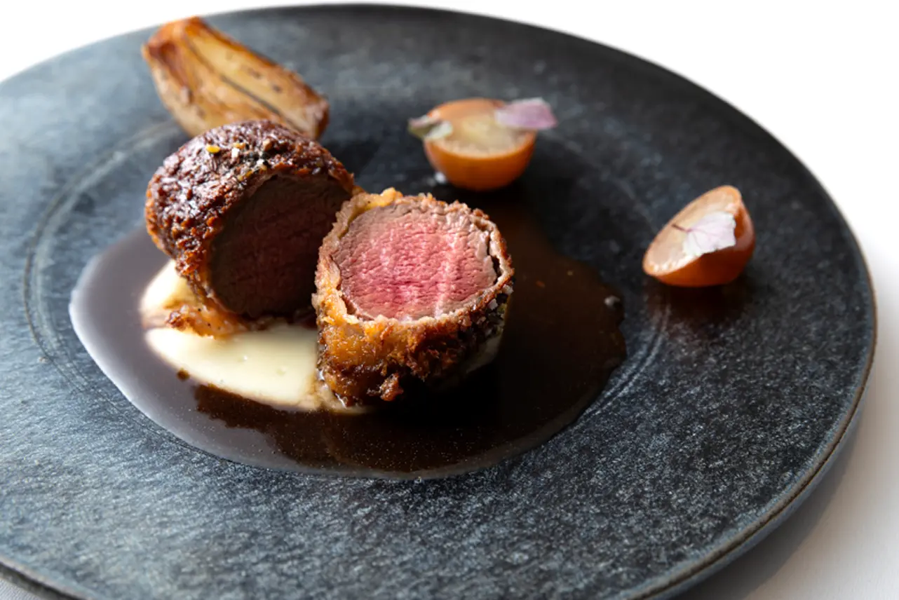 程よい弾力とうま味のある鹿ロースを香ばしく揚げたカツレツに、アマゾンカカオをまぶして仕上げました。ポルト酒とスパイスを効かせた赤ワインソースが深みを添え、甘み豊かなクイーンニーナのコンフィで味わいを引き立てています。