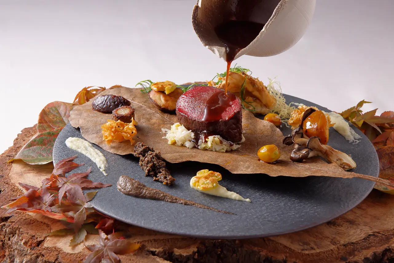 鳥取県産の鹿ロース肉を、炭火でじっくりと低温ロースト。香ばしさの中にやわらかな旨みを閉じ込め、透明感のある鹿のエッセンス(ジュ・ド・シュブルイユ)がその滋味を引き立てます。花びら茸などの季節のきのこの食感、鳥取県産梨のチャツネの甘酸っぱさ、朴葉の香りが重なり合い、山の恵みを多層的に表現。周囲には柿の葉をあしらい、秋の深まりを五感で感じる一皿に仕上げています。