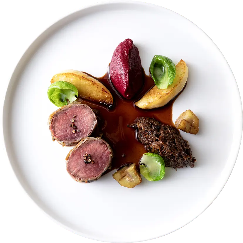 ベーコンで包んだ鹿ロースのロティと、スネ肉とバラ肉は低温でじっくり煮込み、うま味を凝縮させた異なる2つの調理法を楽しめる仕立てにしました。ビーツのピューレ、栗とリンゴで優しい甘みと彩りを添えています。