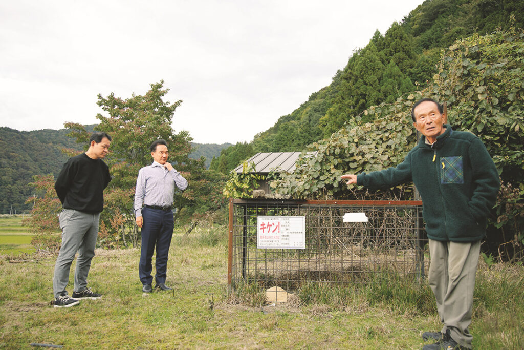 2人が最初に向かったのは県東部に位置する八頭郡の日田集落。ここでは集落全体を高さ2m、全長5kmのワイヤーメッシュ製の柵で囲み、野生動物の侵入を防いで農作物や人を守る。村に設置した箱罠(写真)12カ所、くくり罠複数カ所では年間50頭もの野生動物が罠にかかった年も。被害の状況や村単位で取り組まねばならない現状を目の当たりにし、唐渡さんも松本さんも驚いた表情だ。