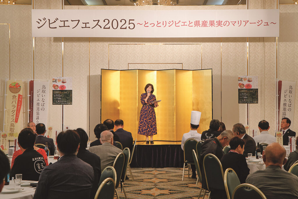 鳥取県と鳥取いなばのジビエ推進協議会が共催するジビエ料理の祭典。3回目を迎えた今回はブッフェ形式とし、県東部を中心とした9店の料理が並んだ。冒頭の挨拶において副知事の中原美由紀さんは「ジビエ料理は“川上から川下”まで連携しないと成り立たない。皆の苦労の結晶ともいえる料理を楽しんで欲しい」と呼びかけ、110名の来場者が堪能した。壇上では「7年前にわかさ29工房の河戸さんと出会い、ジビエの本当の魅力を教わった」と松本さん。「こんなにも素晴らしい素材は広めないといけない」と唐渡さんも話し、共感した来場者から喝采を贈られた。
