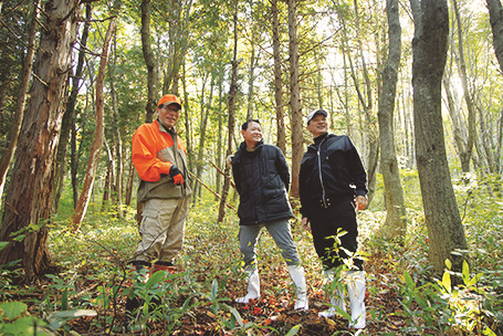 続いては日本料理のオーベルジュを営む傍ら、猟師を務める寺川豊さんを訪ねた。案内してもらったのは大山中腹の標高700mの山中。足跡を指差して「これは雌シカの成獣です」と寺川さん。獣道や木に角をこすった跡など、野生動物の痕跡を次々と見つける。猟の際、野生動物の待ち方や猟の手法、銃についてなど、シェフたちからも質問が続々。普段食材として向き合うジビエが、改めて生き物であると実感した瞬間だ。
